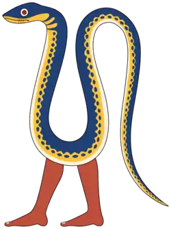 In later periods, he appeared in a semi-anthropromophised form, as a man with the head and tail of a serpent[7] or a serpent with human arms and legs.[7] In this form he appears on amulets, small statues and plaques,[1] with his arms "raised to the mouth to proffer small vessels for food or drink," reflecting his function in the afterlife.[4]