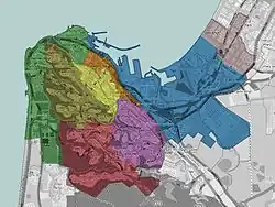 The Israeli city of Haifa is divided into nine quarters, which are subdivided into subquaters, which are further divided into neighborhoods.