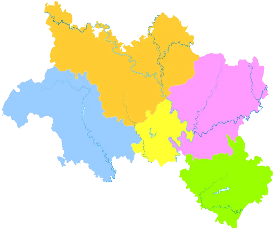 Neijiang (simplified Chinese: 内江; traditional Chinese: 內江; Sichuanese Pinyin: Nui4jiang1; Sichuanese pronunciation: [nuei˨˩˧tɕiaŋ˥]; pinyin: Nèijiāng; Wade–Giles: Nei-chiang) is a prefecture-level city in the southeast of Sichuan province, People's Republic of China. It is located on the Tuo River, midway between the two major cities of Chengdu and Chongqing, is a transportation and food-processing center. The population of the entire prefecture was 3,140,678 at the 2020 census, and the population of the built-up (metro) area was 1,179,140 in the 2 urban districts of Shizhong and Dongxing.
