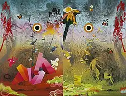 Haddon's paintings have been exhibited in Australia, the US, and Europe. Exhibitions include: Theatre of the World,[15] MONA[16] (and La Maison Rouge, Paris) curated by Jean-Hubert Martin, Platform Los Angeles, Strange Trees,[17] Tasmanian Museum and Art Gallery, Hobart; This Is No Fantasy, Melbourne; and MOP Gallery, Sydney. His paintings were featured in Ten Days on the Island, 2003 and were described by Daniel Thomas as "a high-spirited meeting of Pop art and popular culture with austere reto-Futurist abstraction."[18] He has held several solo exhibitions at Bett Gallery, Hobart.[19]