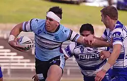 In 2015, Asofa-Solomona graduated to Melbourne's Queensland Cup team, Sunshine Coast Falcons.[10] In Round 8 of the 2015 NRL season, he made his NRL debut for the Melbourne Storm against the Manly-Warringah Sea Eagles, playing off the interchange bench in the Storms' 12–10 loss at AAMI Park.[11][12][13] On 2 May, he again played for the Junior Kiwis against the Junior Kangaroos, playing at prop in the Kiwis' 22–20 loss at Cbus Super Stadium.[14][15] In Round 20 against the St George Illawarra Dragons, he scored his first NRL career try in Melbourne's 22–4 win at McLean Park.[16] He finished off his debut year in the NRL having played in 12 matches and scoring one try.[17]