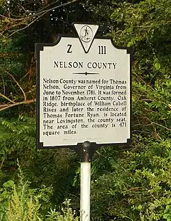 Nelson County was created in 1807 from Amherst County. The government was formed the following year.[4] The county is named for Thomas Nelson Jr., a signer of the U.S. Declaration of Independence, who served as Governor of Virginia in 1781. An earlier Virginia county, also named in his honor, became part of Kentucky when it separated from Virginia in 1792.