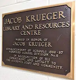 The school's library and resources centre, located on the main floor of the school, also stands in dedication of a former superintendent of schools of Norwood School Division No.8: Jacob Krueger.