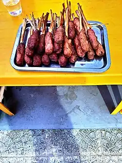 Nem nướng (literally "grilled spring rolls") is Vietnamese grilled pork sausage or grilled meatballs,[1] and a popular Vietnamese food item, sometimes served as an individual appetizer or snack, or served with rice noodles or rice as a main course. Nem nướng is a specialty of Khánh Hòa Province (Nha Trang).[2] Nem nướng is a rustic dish, originating from Ninh Hoa, a northern district of Khanh Hoa province, about 30 km from the coastal city.