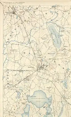 During the late 19th century, several steamboats were operated along the Nemasket, offering cruises of the river and into Assawompsett Pond.[5] Once a popular tourist destination, the cruise business ultimately ended upon construction of the dam where the river drains out of Assawompsett, which both restricted the ability for vessels to travel and also lowered the water level of the river. The tie-up for one side-paddle wheeler, the Assawompset, can still be seen off the canal that cuts across the right hand side of the marsh between Bridge Street and Vaughn Street.