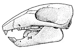 The genus Nemegtbaatar (Kielan-Jaworowska, 1974) was named after the Nemegt Valley and Ulan Bator, the capital of Mongolia. The type species is Nemegtbaatar gobiensis. It was discovered in Campanian aged strata of the Barun Goyot Formation in the Gobi Desert of Mongolia.[1] Fossils of this species have been found in rocks dated from 76 to 71 million years ago, correlating to the Campanian and early Maastrichtian ages.[2] With several intact skulls having been found, it can be determined that N.gobiensis has a dental formula of 2.0.4.21.0.2.2 with a "roughly triangular" snout.[3] Nemegtbaatar is possibly derived from a Bulganbaatar ancestor, based on a comparison of their dentition.[4]