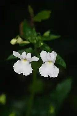 Nemesia floribunda grows to a height of between 30.48 centimetres (12 in) and 60 centimetres (24 in). Its flowers are 10–15 mm (0.4–0.6 in) in diameter, and are white, with a pale yellow throat. It has 3–12 cm (1.2–4.7 in) long leaves that are shortened and rounded with a wavy blade and narrow tip. Its seeds are 1 millimetre (0 in) with large wings, and the plant flowers between February and September.[3][5]