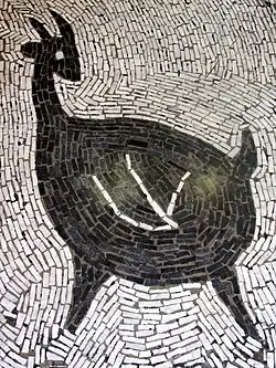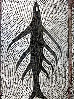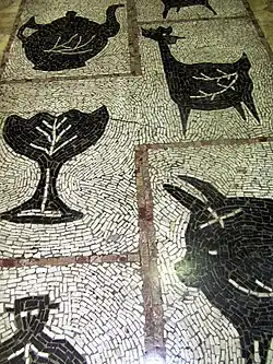 In even worse conditions is Quinchamalí (1958) at the Juan Esteban Montero Gallery: the paint of the mural is peeling and warping due to the humidity. The art restorer Carolina Broschek maintains that the mural can be saved, but the owner of the building on which it is painted, Yusif Tala, opined that the Nemesio Antúnez Foundation should take care of the painting or move it to another place, as has no interest in preserving it.[2] In the same gallery, besides the mural, Antúnez installed floor mosaics which are still in perfect condition.