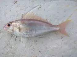 Nemipterus peronii has its dorsal fin supported by 10 spines and 9 soft rays while the anal fin contains3 spines and 7 soft rays.[2] The spines of the dorsal fin are elongate and there is a deep notch between the spiny part of the dorsal fin and the soft rayed part. Its body has a standard length that is 3.1 to 4.1 times its depth and it has a snout that is roughly equal in length to the diameter of the eye. There are 3 or 4 pairs of canine-like teeth in the front of the upper jaw.[6] The short pectoral fins do not reach the anus while the moderately long pelvic fins extend to the level of the anus. The caudal fin has a deep fork with the upper lobe being pointed and a little longer than the lower lobe. The colour of the upper body is pinkish marked with 7 or 8 vaguely delineated pink saddle marks extending as far as or a little beyond the lateral line. The lower body is silvery with the scale rows being marked with indistinct golden lines. There is a vague reddish spot just below the front end of the lateral line. The snout has a golden line on it that passes through the nostrils. There is a silvery-purple area underneath the eye and the preoperculum and operculum have a golden sheen. The dorsal fin has an overall colour of pale whitish pink, with a light yellow line or row of spots just over its base and the tips of the spines are orange. The anal fin has a similar colour to the dorsal but has a yellow tint on its central part. The caudal fin is pinkish, the pelvic fins are white with a yellow scale at their bases and the pectoral fins are translucent.[6] The maximum published standard length of this fish is 29 cm (11 in), although 17 cm (6.7 in) is more typical.[2]