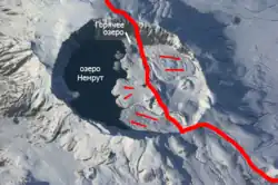 Nemrut was probably formed in the early Quaternary Period, about 1 million years ago. It showed the greatest activity in the Pleistocene, with regular eruptions occurring in the Holocene.[2] In the middle Pleistocene, about 250,000 years ago, a major eruption formed a lava flow over 60 km long, which blocked the water discharge from the Van basin and formed Lake Van, the world's largest alkali endorheic lake.[3][4] In the same period, the conical top of the volcano collapsed inward, forming an 8.3×7 km caldera.[2] Later, the freshwater Lake Nemrut formed inside the caldera.[5] Subsequent eruptions separated a small lake Ilı from Lake Nemrut.