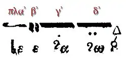 His exegesis of this short apechema sets the chromatic or enharmonic tetrachord between plagios protos (πλ α') and tetartos (δ'), so that the diesis lies between tritos (γ') and tetartos (δ'):