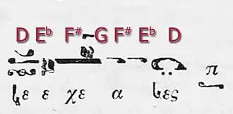 νε [ison]—να [dikentimata: small tone]—να [oligon: one and a half of the great tone]—νὼ [oligon with diple: diesis or quarter tone]