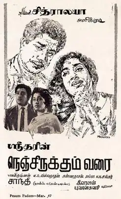 Nenjirukkum Varai (transl. As long as there is a heart) is a 1967 Indian Tamil-language film, directed and produced by C. V. Sridhar. The film stars Sivaji Ganesan, Muthuraman, Gopalakrishnan, K. R. Vijaya and Geetanjali. It revolves around a man struggling with poverty, falling in love with his house owner's daughter.