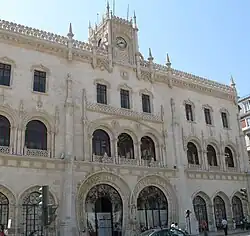 Neo-Manueline started with the construction of the Pena Palace in Sintra by Ferdinand II between 1839 and 1849.[2] Another pioneering project was the restoration of the Jerónimos Monastery in Lisbon during the 1860s, in which the Manueline monastery gained a new tower and annexes built in Neo-Manueline style (which now house the Maritime Museum and the National Archaeology Museum). During this time the iconic Belém Tower was also restored with several Neo-Manueline additions. Other important Neo-Manueline buildings in Portugal are Rossio Railway Station, Lisbon (1886–90), Palace Hotel of Bussaco (1888–1907), the Sintra Town Hall (1906–09), the Counts of Castro Guimarães Palace in Cascais (1900) and the Quinta da Regaleira in Sintra (1904–10). The Neo-Manueline was also used in smaller buildings like private houses.