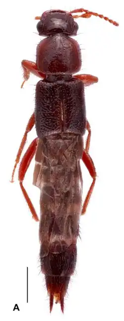 Neolindus triangularis is a species of beetle of the family Staphylinidae. This species is known from the type locality in French Guiana (Saint-Laurent-du-Maroni, Saül, Monts La Fumée), the surrounding forest, and an area around 130 km south-east from the type locality (Cayenne, Matoury).