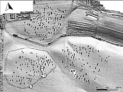 A remarkable discovery at the settlement was the excavation of nearly 120 individuals in the area of the ditch. The burials can be divided into two main categories: regular burials in typical crouched positions with grave goods, and irregular burials, in which the heads of the deceased were often removed.[4] A mass grave, discovered in 2021, contained numerous individuals buried in a stacked manner.[5][6] To date, 81 people have been documented in this mass grave, almost all of whom were buried without heads. Only one infant was buried with its head. The reason for the absence of heads remains unclear.