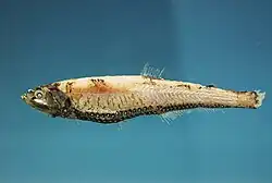 Neoscopelus macrolepidotus, also known as a large-scaled lantern fish, is a species of small mesopelagic or bathypelagic fish of the family Neoscopelidae, which contains six species total along three genera.[1] The family Neoscopelidae is one of the two families of the order Myctophiformes. Neoscopelidae can be classified by the presence of an adipose fin. The presence of photophores, or light-producing organs, further classify the species into the genus Neoscopelus.[2] N. macrolepidotus tends to be mesopelagic until the individuals become large adults, which is when they settle down to the bathypelagic zone.[2]