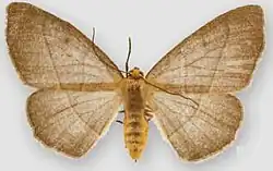 The ground colour is orange brown with distinct medial and postmedial lines crossing the forewings. It may be distinguished from similar species by the rounded apex and orange-brown colour of the forewings.[1]