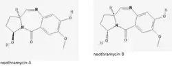 Neothramycin A and B are stereoisomeric antibiotics with anticancer activity. The stereoisomers are interchangeable in aqueous solution and the antibiotic, Neothramycin, contains both in approximately equal amounts.[1] They belong to the pyrrolo(1,4)benzodiazepine, or anthramycin, group which includes other antibiotics such as anthramycin, tomaymycin, and sibiromycin. Neothramycin was originally isolated from Streptomyces No. MC916-C4, a cycloheximide-producing strain, by Umezawa et al.[2] Subsequent testing has shown its capabilities as an anticancer drug, antiprotozoal drug, and even possible uses in DNA fluorescence based assays.[3] Its activities against cancer warranted phase I testing of the drug.[4] More recently, in 1991, anthramycin derivatives, which are very similar to neothramycin, have been investigated for their ability to link DNA when dimerized. These compounds were tested using a fluorescence based assay. These compounds showed an ability to bind dG-containing DNA duplexes with high specificity. This specificity of a DNA crosslinking agent is highly sought after since most are electrophiles and bind indiscriminately. The data collected also showed that pyrrolo(1,4)benzodiazepines can also be used to measure the fluorescence polarization anisotropy on the 0.1-100 ns time scale.[5]