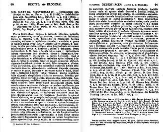 - ^ a b c d e f g (in Latin) Hooker, J.D. 1873. Ordo CLXXV bis. Nepenthaceæ. In: A. de Candolle Prodromus Systematis Naturalis Regni Vegetabilis 17: 90–105.