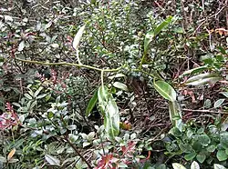 Nepenthes × trusmadiensis has petiolate leaves measuring up to 50 cm in length. The pitchers of this hybrid are some of the largest of any Bornean Nepenthes species,[5][6] reaching 35 cm in height. They are roughly intermediate in form between those of its parent species. The lid is held away from the mouth as in N. lowii and bears short bristles on its lower surface.[4] The peristome has prominent ribs and teeth, but is not as developed as that of N. macrophylla.[7] The inflorescence of N. × trusmadiensis may be up to 50 cm long and has two-flowered pedicels.[3] Despite the size of the pitchers, this hybrid is not large in stature.[4]