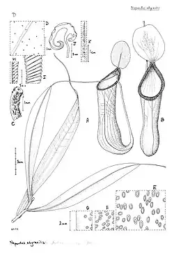 Rosette, lower and intermediate pitchers remain unknown as they do not form part of the examined herbarium material. Upper pitchers are subcylindrical with an ellipsoid base. They measure c. 16.4 cm in height by 5.5 cm in width. They are broadest in the basal portion, becoming slightly constricted in the middle (4.1 cm wide), and expanding again to around 5 cm below the peristome. Sessile glands similar to those found on the stem are also present on the exterior of the upper pitchers, where they occur at a density of 3–4 per mm². In these aerial traps the wings are reduced to a pair of ridges on the ventral surface of the pitcher cup. The pitcher mouth is ovate and has an oblique insertion. It measures around 6 cm by 4 cm. The peristome is cylindrical in cross section and slightly lobed, with tightly infolded inner and outer margins. It is rather narrow, measuring only 2.5–4 mm in diameter. The peristome bears low ribs only 0.1 mm high. These are tightly packed, occurring at a density of two per millimetre. The inner margin of the peristome lacks conspicuous teeth. The peristome is elongated into a short neck and here the apertures of the marginal nectar glands are clearly visible.[1]