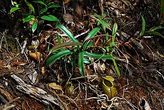 Leaves are coriaceous and sessile.[7] The lamina (leaf blade) is linear to slightly lanceolate[4] or narrowly elliptic[7] and measures up to 18 cm in length by 3 cm in width.[4] Its apex is acute or obtuse,[4] whereas the base is slightly attenuate and clasps the stem for half to three-quarters of its circumference.[7] It is also slightly auriculate and has an oblique attachment to the stem.[7] The laminar base may be decurrent down the stem to varying degrees[4] or not decurrent at all.[7] Three longitudinal veins are present on either side of the midrib and restricted to the distal third of the lamina.[7] Pinnate veins are abundant and run obliquely to the laminar margin.[7] The tendrils are proportionately very long, especially those bearing lower pitchers, which may be more than 30 cm long.[4]