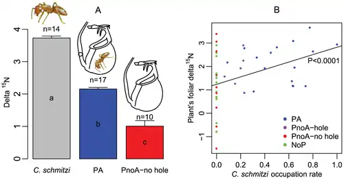 Centre: Nitrogen flux from C. schmitzi colonies to an N. bicalcarata host plant (c. 1.4 m diameter). The bars show the change in 15N concentration in the host plant's leaves two weeks after a pulse of 15N was fed to the associated C. schmitzi colonies. Leaf node 1 has the youngest (still developing) leaf, with the others numbered sequentially as one moves down the stem. The pictograms below the graph show the state of each leaf and pitcher, and indicate the presence or absence of C. schmitzi and whether a 15N pulse was administered.[44]