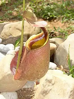 The two thorns that give N. bicalcarata its name are unique to this species and bear some of the largest nectaries in the plant kingdom.[21][22][23] The purpose of these structures has long been debated among botanists. Frederick William Burbidge suggested that they might serve to deter arboreal mammals such as tarsiers, lorises and monkeys from stealing the contents of the pitchers.[11][24] In an article published in 1982, Cliff Dodd speculated on the function of the thorns, but did not believe they play a role in prey capture.[25] Charles Clarke observed that monkeys and tarsiers rip the pitchers open at the sides in order to feed from them, rather than reaching in through the pitcher mouth.[26] However, he found that the mammals attacked the pitchers of N. bicalcarata less frequently than those of other species, such as N. rafflesiana.[26] Clarke's observations suggest that the spines likely serve to lure insects into a precarious position over the pitcher mouth, where they may lose their footing and fall into the pitcher fluid, eventually drowning.[26] A similar trapping method is employed by the Sumatran endemic N. lingulata, which has a single filiform appendage positioned over the pitcher mouth. However, in that species the appendage is a structure of the lid and not the peristome.[27]