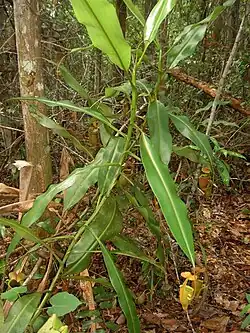 The leaves of N. bicalcarata are petiolate and coriaceous in texture. The lamina is obovate-lanceolate in form and also reaches huge dimensions, growing to 80 cm in length and 12 cm in width.[14] It is slightly decurrent on the stem, forming two narrow wings. The lamina has indistinct longitudinal veins and numerous pennate veins. The tendrils may be up to 60 cm long and 8 mm wide. They are hollow and swollen near the pitcher,[11] and are the primary residence of the ants. The ants get much of their food from numerous, large extrafloral nectaries.