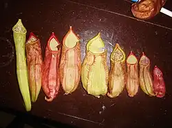 Rosette and lower pitchers are either wholly ovate or only ovate in the basal third of the pitcher cup and narrower above. They measure up to 12 cm in height by 5 cm in width and are broader than they are deep. The hip, when present, is positioned in the midsection of the trap. A pair of wings (≤6 mm wide) runs down the ventral surface of the pitcher cup, bearing narrow fringe elements. The pitcher mouth is orbicular to ovate and has an oblique insertion. The peristome is cylindrical and up to 5 mm wide at the sides, with teeth up to 0.3 mm long. The pitcher lid or operculum is orbicular to ovate or elliptic. It is flat and has a slightly cordate base. It measures up to 4 cm in length by 3.5 cm in width. The lower surface of the lid does not have any appendages, but bears numerous crater-like glands (≤1 mm in diameter), the largest of which are located around the base of the midline. An unbranched spur (≤6 mm long) is inserted near the base of the lid. On their outer surface, terrestrial pitchers are typically green to orange or pink with red stripes. Red blotches may or may not be found in the waxy zone of the inner surface. The peristome ranges in colour from green to red.[1]