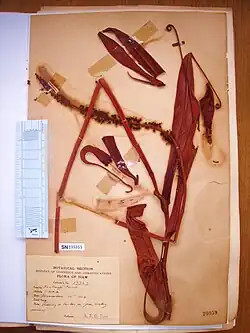 Nepenthes chang was formally described by Marcello Catalano in his 2010 book, Nepenthes della Thailandia: Diario di viaggio.[3] The description was reviewed by Alastair Robinson, while Andreas Fleischmann provided the Latin translation.[1] Catalano 013394 was designated as the holotype. This specimen was collected by Catalano in 2009 from Ko Chang island at an altitude of about 300 m. It is deposited at the Chulalongkorn University Herbarium (BCU).[1]