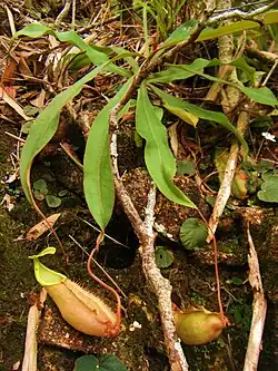 Leaves are sessile and coriaceous in texture. The lamina (leaf blade) is lanceolate, measures up to 35 cm in length by 5 cm in width, and is around 0.2 mm thick. Its apex is acute and it is attenuate at the base, clasping the stem for around three-quarters of its circumference and being decurrent for up to 4 cm. Three longitudinal veins are present on either side of the midrib, restricted to the distal quarter of the lamina. Pinnate veins are also visible, and arise obliquely from the midrib. Tendrils are up to 30 cm long and 2 mm in diameter. They are coiled in upper pitchers. The laminae of older leaves are typically dark green, whereas those of younger leaves range in colour from reddish in rosettes, through an orange hue on laminae of the lower stem, to yellowish on the upper stem. Like the stem, the midrib and tendrils are orange to red in rosettes and light green in climbing plants.[1]