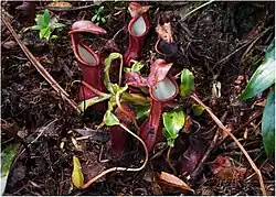 This species is closely related to N. benstonei of Bukit Bakar even some argue that both of them are basically the same species but with some variations.[3][4] However, the lower pitchers of Nepenthes domei were noted to be rounder and stouter compared to those of N. benstonei and they exhibit burrowing behavior which is a rather unique characteristic not observed in the later taxon.[1][4] The pitchers of N. domei tend to burrow deep into the humus with the mouth parts pop up out of the ground and 3/4 of the lower parts remain buried. This adaption could be advantageous in trapping insects crawling close to the forest floor and this burrowing behavior is persistent in plants grown in glasshouse where the growing tendrils would penetrate sphagnum, or loose substrate, before the tips inflated into reddish pitchers. Mature plants of N. domei with climbing stems tend to produce often half-buried rosette pitchers that are attached to shorter tendrils with reduced leaf blade (lamina). Compared to N. benstonei whose lids are ovate, the lids of N. domei lower pitchers are much narrower even some individuals have lanceolate lids.[1]