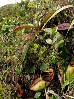 The species grows terrestrially. It is most abundant above 1,650 m, where it is found among stunted montane scrub vegetation on the summit and summit ridge, and forms a frequently-flowering, compact rosette. The most vigorous populations are said to grow in "sheltered scrub, amongst boulders just below the summit".[2][3] Etiolated vining plants of N. gantungensis have been found above 1,600 m in "shrubby montane forest".[2][3] Specimens growing in such shaded conditions climb to the height of the canopy. Like its close relatives,[note a] N. gantungensis is apparently outcompeted by bamboo.[8] It is not sympatric with other Nepenthes species and no natural hybrids involving it have been recorded.[2]