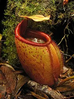 Rosette and lower pitchers are wholly ovate to urceolate. They grow up to 20 cm high by 7 cm wide. A pair of wings up to 12 mm wide runs down the ventral surface of the pitcher cup. These wings bear filiform fringe elements up to 10 mm long. The pitcher mouth is oval to circular and up to 6 cm across. It has an oblique insertion and rises at the rear to form a conspicuous neck. The peristome is cylindrical to slightly flattened and up to 2 cm wide for most of its length, becoming broader towards the neck (≤3 cm wide). It bears ribs up to 2 mm high and spaced up to 2 mm apart, which terminate in teeth (≤4 mm long) on the peristome's inner margin. The digestive zone usually covers the entirety of the pitcher's inner surface. The pitcher lid or operculum is elliptic and measures up to 6 cm in length by 4.5 cm in width. It lacks appendages or a keel. A spur is inserted near the base of the lid. It measures up to 9 mm in length, with a basal diameter of up to 2 mm, although it may be much smaller.[2]