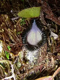 The pitcher mouth is often distinctly rhomboid in shape, but may also be oval[4] or elliptic. It has a highly oblique insertion and is concave when viewed in profile. The mouth rises at the rear to form a tapered neck, which may be held upright or be inclined forward over the pitcher orifice. The species is noted for having possibly the most developed peristome in the genus. It is cylindrical to slightly flattened,[7] glossy, rigid, and up to 5 mm wide (excluding the teeth). It consists of expanded ribs up to 6 mm high and spaced up to 5 mm apart. The entire flanges can measure up to 15 mm in length, although their size and number differ between populations[4] (a typical number being approximately 20 on each side of the orifice). These flanges form exceptionally long, incurved teeth at the inner edge of the pitcher orifice. The teeth are sickle-shaped (falcate) and extend approximately 7 mm into the interior, as measured from the inner edge of the peristome to the tooth apex. The outer edge of the peristome is entire, with the recurved flanges extending for around 2 mm past the rim. The teeth of the neck may assume a dagger-like shape and measure up to 10 mm by 2 mm.[7] These uppermost teeth are often noticeably splayed forward.[4]