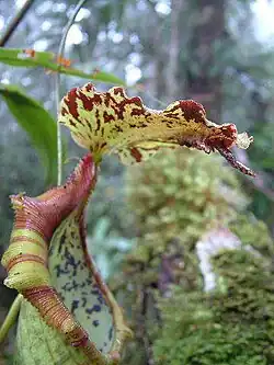 Nepenthes naga is a tropical pitcher plant endemic to the Barisan Mountains of Sumatra. It is characterised by a forked sub-apical appendage on the underside of the lid and an undulate lid margin.[2] The specific epithet naga is the Indonesian word for "dragon" and refers to the distinctive lid appendage of this species as well as the large size of its pitchers. The name also references local folklore, which tells of dragons occurring in this species's habitat in the past.[2]