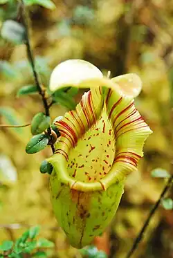 Rosette and lower pitchers are either infundibular in the lower third to half and ovoid above, or ovoid throughout. They reach 25 cm in height and 9 cm in width. A pair of fringed wings (≤15 mm wide) runs down the front of the pitcher. The glandular region covers the lower third to half of the inner surface. The glands are overarched and occur at a density of 400 to 1,300 per square centimetre.[2] The pitcher mouth is round and elongated into a wide neck. The peristome is flattened, expanded, and up to 40 mm wide. A series of teeth (≤7 mm wide) line its inner margin. The peristome ribs are spaced 0.5 to 1.5 mm apart. Pitchers bear 14 to 18 longitudinal nerves across their height.[2] The pitcher lid is ovate and usually has a hook-shaped appendage on the underside near the peristome. A branched spur (≤5 mm long) is inserted near the base of the lid.[8]