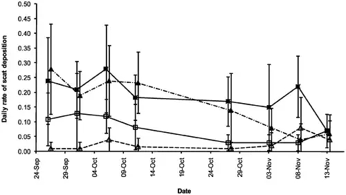 Right: Scat deposition rates to N. rajah pitchers. Black squares show the mean number of T. montana droppings found within pitchers; white squares show the mean number found outside pitchers. Black and white diamonds show the same for R. baluensis.[26]