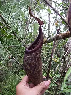 | An upper pitcher of Nepenthes rigidifolia at the type locality near Sidikalang, Sumatra | |