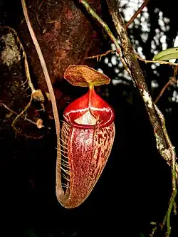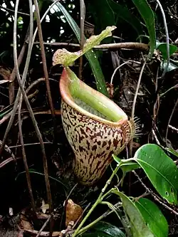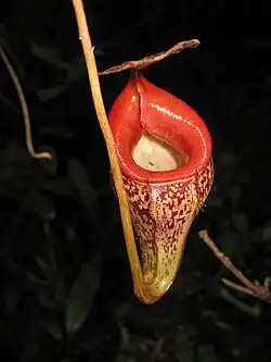 Rosette and lower pitchers are only produced briefly before the plant starts to climb. They are either entirely ovate or only ovate in the upper half and infundibular below. They often narrow just below the peristome. Terrestrial pitchers grow to 10 cm in height by 6 cm in width. A pair of fringed wings (≤10 mm wide) usually runs down the ventral surface of the trap, bearing filaments up to 8 mm long, although these wings may be absent altogether or only extend for a portion of the trap's length.[9] The pitcher mouth is round and positioned horizontally in the front two-thirds, rising at the rear to form a short neck.[8] The peristome is flattened, strongly incurved, and measures up to 15 mm in width. It bears ribs up to 0.8 mm high and spaced up to 1 mm apart. These ribs terminate in distinct teeth (≤3 mm long) on the inner margin of the peristome.[9] The inner portion of the peristome accounts for around 78% of its total cross-sectional surface length.[15] The peristome forms a short neck at the rear, where the teeth form two parallel rows. The inner surface is wholly glandular;[8] there is no waxy zone.[15] The pitcher lid or operculum is ovate to elliptic and has a cordate base. It measures up to 6 cm in length by 5 cm in width. It bears no appendages on its lower surface. A flattened spur measuring up to 5 mm in length is inserted near the base of the lid. It may or may not be branched. Lower pitchers are typically light yellow to olive green and speckled with red or purple. The inner surface is a light shade of yellow. The peristome is generally yellow or orange in freshly opened traps, later becoming dark red to purple as the pitcher matures. The upper surface of the lid is often yellow with orange to purple blotches, whereas the underside may be completely red, although this is not always the case.[9]