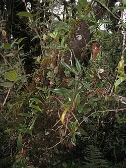 The typical habitat of N. talangensis is mossy upper montane forest, where it is almost exclusively terrestrial, but rarely may also be found as an epiphyte. It may grow in shady conditions under dense tree cover or among open, stunted shrubs where it is exposed to strong or even direct sunlight.[8][9] At lower elevations of as little as 1,800 m, N. talangensis is found in dense mossy forest, where it is sympatric with N. gymnamphora and N. inermis.[8] Nepenthes talangensis is seldom sympatric with N. bongso, despite the latter being common on Mount Talang. This is because the two species occupy distinct ecological niches; N. bongso is typically an epiphyte in lower montane forest, whereas N. talangensis usually grows terrestrially in upper montane forest.[8] Natural hybrids with all three sympatric Nepenthes species have been recorded.[8]