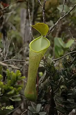 Nepenthes tentaculata is also similar to N. murudensis, which is often described as resembling a giant form of the species.[3][16] Nepenthes murudensis differs in lacking filiform hairs on the upper surface of the lid, being more robust in all respects, and having a dense indumentum on inflorescences and some vegetative parts.[16][24][25] However, a number of populations of N. tentaculata from northern Sarawak produce pitchers exceeding 20 cm in height and these may be very similar in appearance to N. murudensis.[16] Nepenthes murudensis also differs in that its aerial pitchers lack wings. Although N. tentaculata is variable in this respect, plants from Mount Murud usually produce upper pitchers with wings.[20]