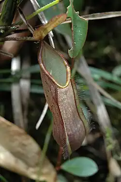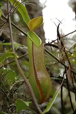 The pitchers of N. tentaculata are generally quite small, rarely exceeding 15 cm in height.[3] However, in exceptional specimens they may be up to 30 cm high by 8 cm wide. Rosette and lower pitchers are ovoid in the basal third and cylindrical above. Upper pitchers are more cylindrical throughout. A pair of fringed wings runs down the front of lower pitchers, while in upper pitchers these are often reduced to ribs. The pitcher mouth is usually ovate, becoming acute at the front and rear. Its insertion very oblique. The peristome is roughly cylindrical in cross section and up to 5 mm wide. It bears small ribs and its inner margin is lined with tiny teeth.[16] The inner portion of the peristome accounts for around 57% of its total cross-sectional surface length.[17] The pitcher lid or operculum is ovate and typically obtuse. Often, numerous filiform appendages are present on the upper surface of the lid, concentrated near the edge.[16] However, some forms of the species lack these structures altogether.[3]