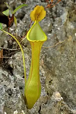 Shortly before the N. viridis type description went to print,[18] botanists Martin Cheek and Matthew Jebb published a series of papers splitting N. alata sensu lato into several daughter taxa, including the newly delimited N. alata sensu stricto (restricted to northern Luzon), the newly resurrected N. graciliflora (Bohol, Leyte, Luzon, Mindanao, Mindoro, Panay, Samar, and Sibuyan), as well as the newly described N. negros (Biliran and Negros) and N. ramos (Mindanao).[15][16] Under this new classification, most populations previously regarded as N. alata now fall under N. graciliflora.[1] Though the N. viridis type description made mention of these taxonomic changes, the authors noted that Cheek and Jebb's determinations were based solely on herbarium material and did not involve field research. Moreover, they noted that the status of the "N. alata group" in Mindanao remained unclear, since both N. alata and N. graciliflora usually have flowers borne singly on pedicels, whereas populations with two-flowered partial peduncles are known from Mindanao. They added that the description of N. ramos (a species from Mindanao with two-flowered partial peduncles) did not resolve the situation, as the lower pitchers of this species remained unknown.[1][19] For these reasons the authors decided to compare N. viridis not against N. alata s.s. as defined by Cheek and Jebb, but against N. alata s.l. as described in B. H. Danser's 1928 monograph, "The Nepenthaceae of the Netherlands Indies",[20][nb 1] and later refined in Stewart McPherson's 2009 work, Pitcher Plants of the Old World.[23]