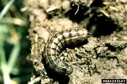 The larva feeds on various grasses, including cereal crops and corn.