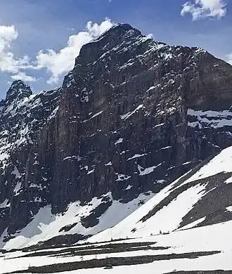 The first ascent was made on September 2, 1902 by J. Norman Collie, Hugh E.M. Stutfield, G.M. Weed, H. Woolley, guided by Christian Kaufmann[7][1] On April 10, 2016 Luka Lindič and Marc-André Leclerc completed the first ascent via the NE face. They named the route "Psychological Effect (700m, WI5+ M7)".[8] Brette Harrington and Tony McLane made the second ascent via the NE face on August 5, 2020.[9]