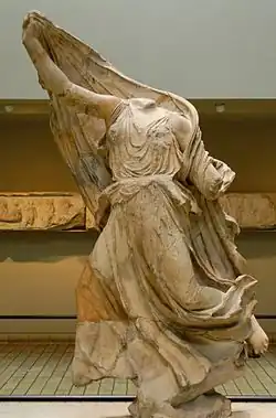 The monument is now named after the life-size female figures in wind-blown drapery.[24] Eleven survive, which would have been enough to fill the spaces between columns on the east and west sides, and the three on the north. Jenkins speculates that there might never have been figures on the south side. They are identified as sea-nymphs because various sculpted sea creatures were found under the feet of seven of them, including dolphins, a cuttlefish, and a bird that may be a sea-gull. They have generally been called Nereids, though Thurstan Robinson argues that this is imposing a Greek perspective on Lycian sculptures, and that they should rather be seen as eliyãna, Lycian water-nymphs associated with fresh-water sources and referenced on the Letoon trilingual inscription, which was discovered a few kilometres to the south of the site of the Monument.[25]