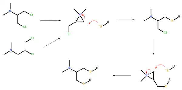 Bensultap (R=SO2Ph) was made by the reaction of the sodium salt of benzenethiolsulfonate (PhSO2SNa) with N,N-dimethyl 1,3-dichloro-2-propylamine or N,N-dimethyl 2,3-dichloropropylamine in ethanol.[10]